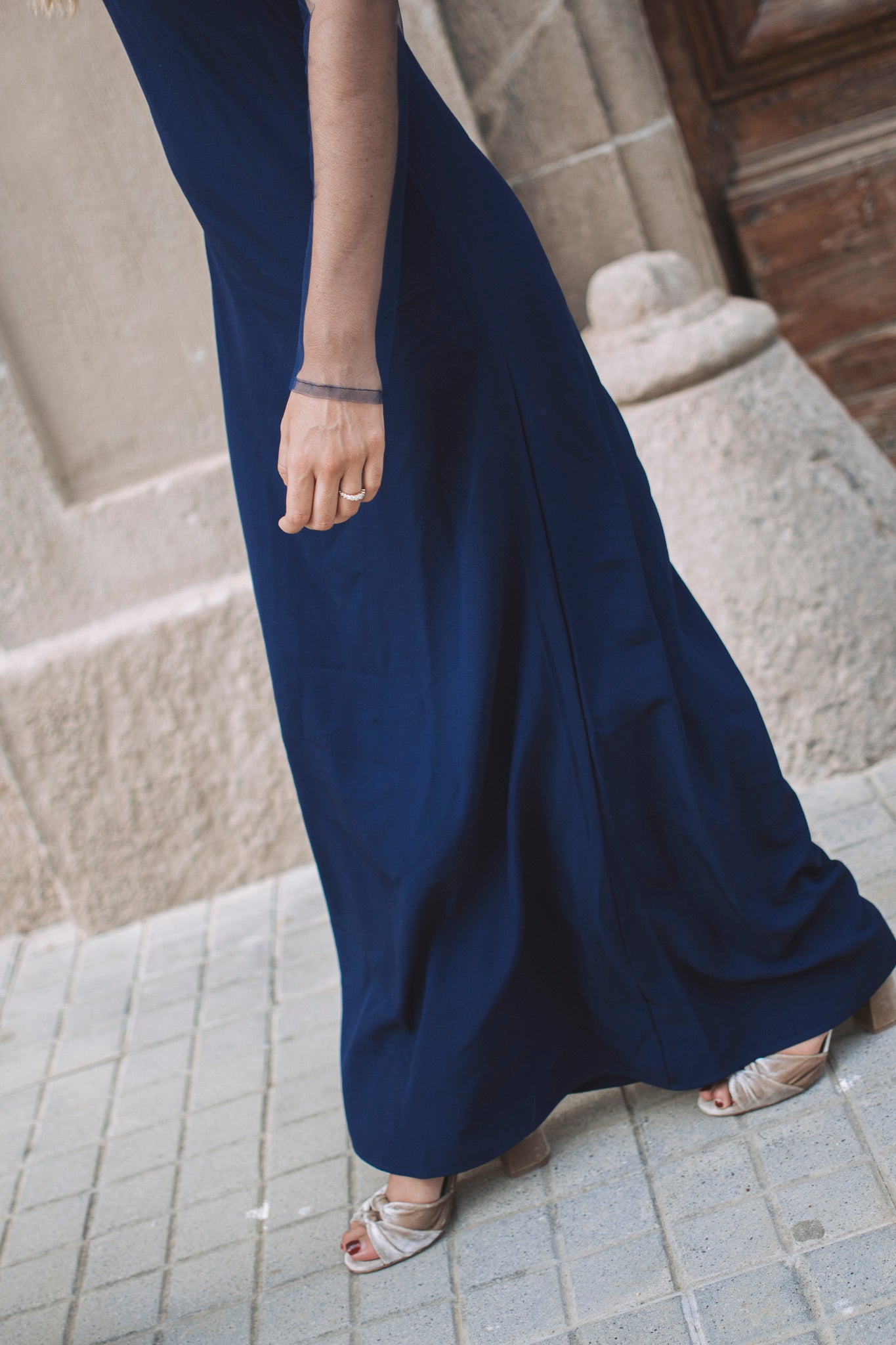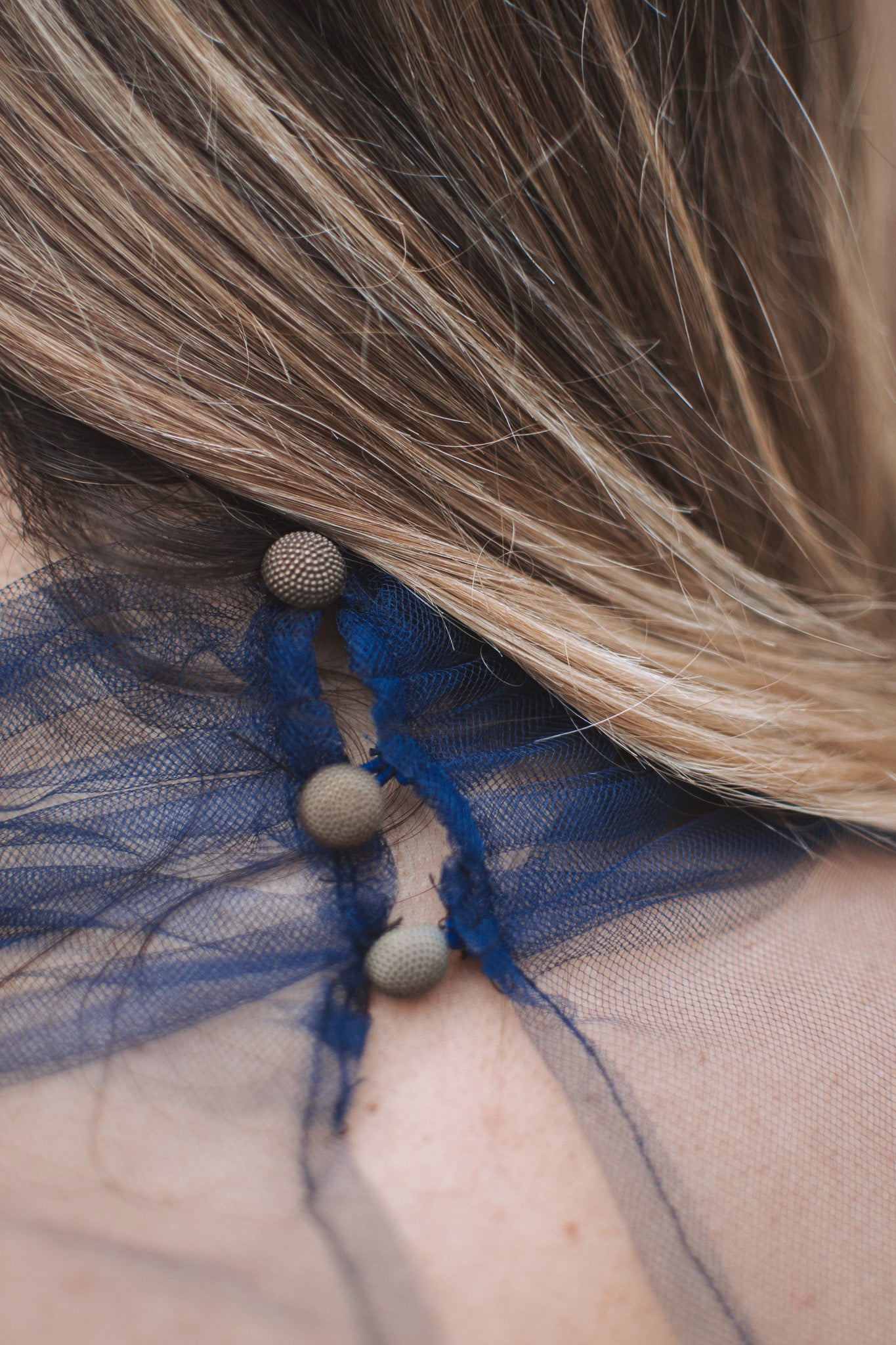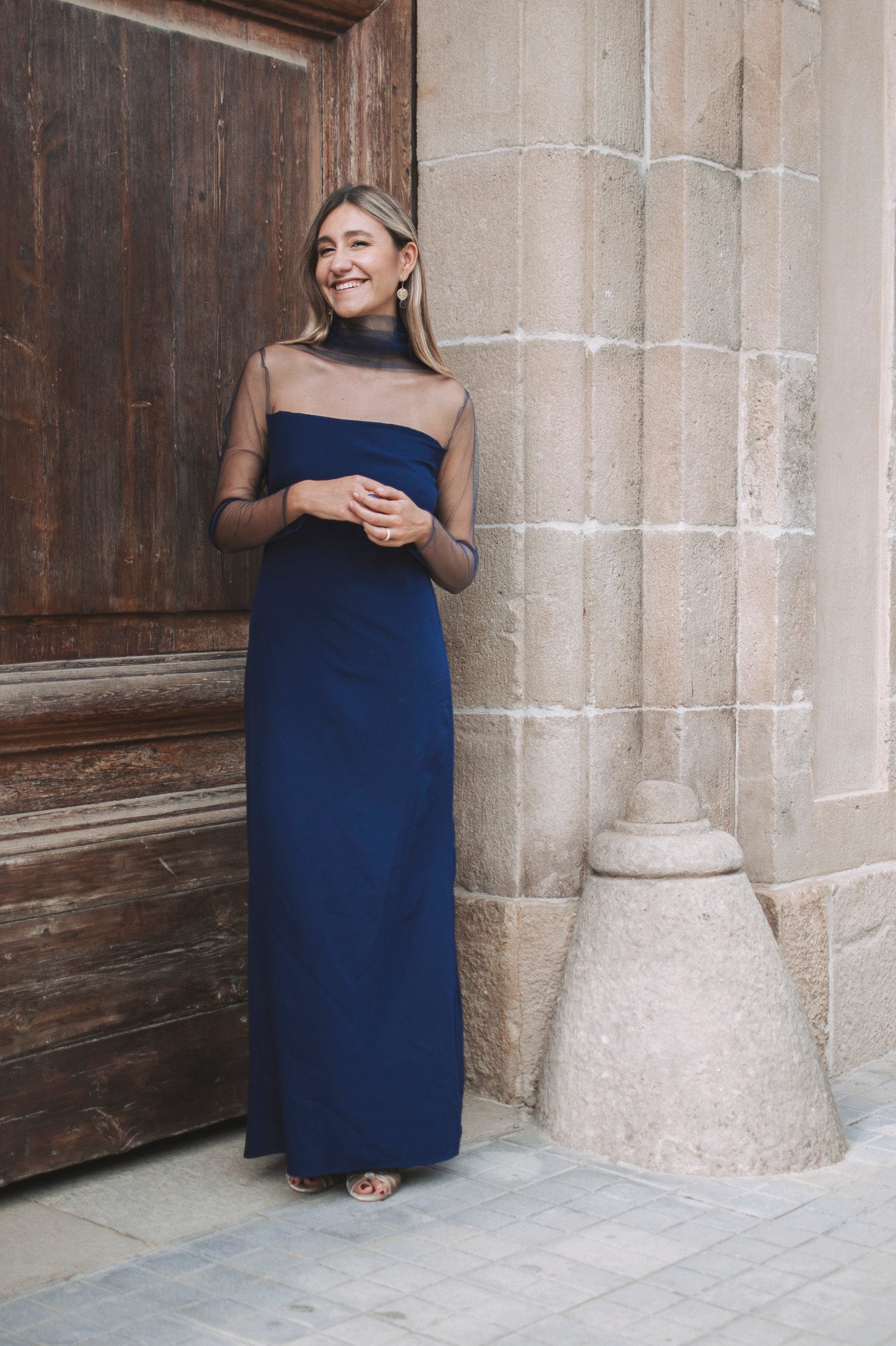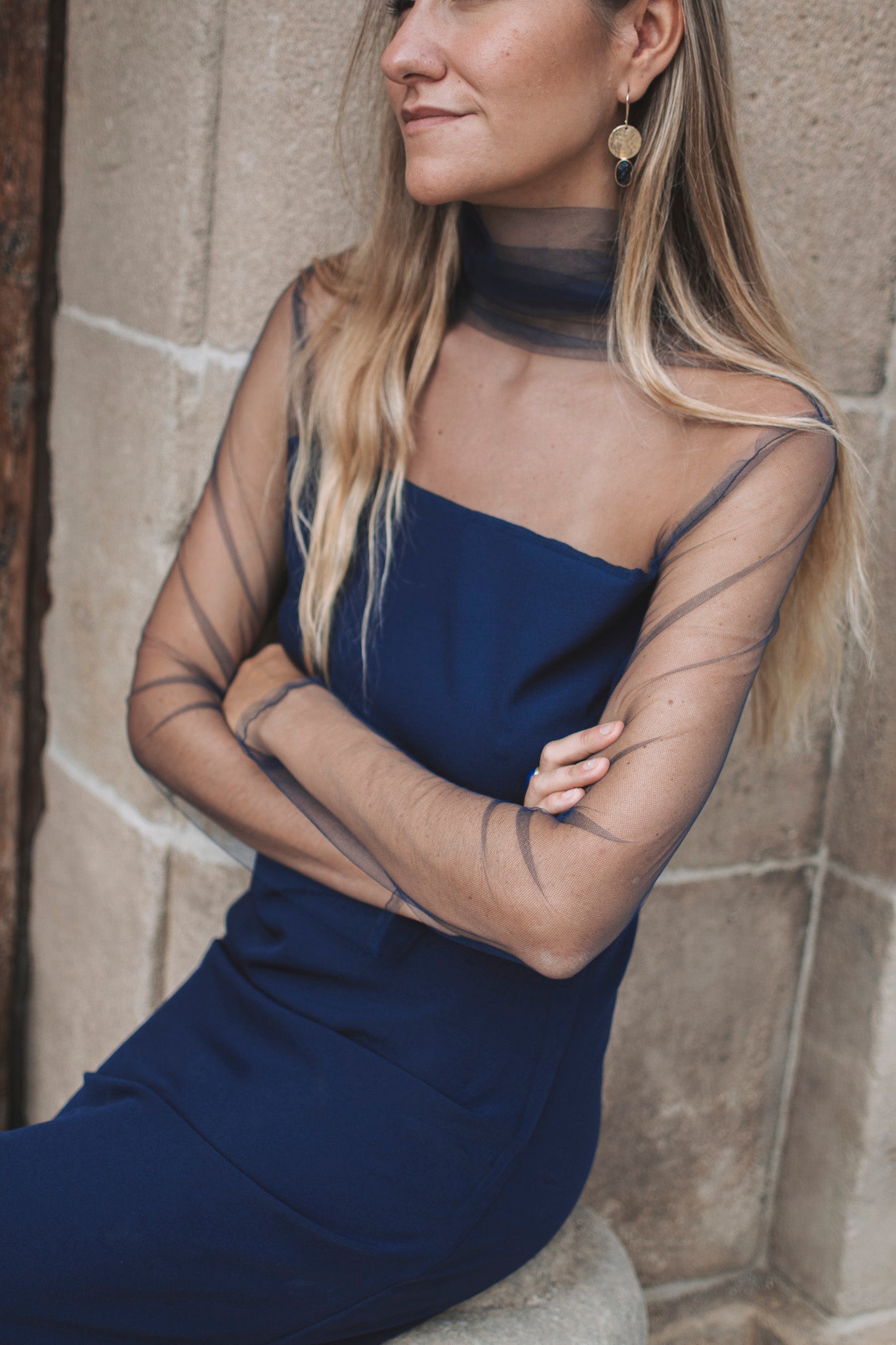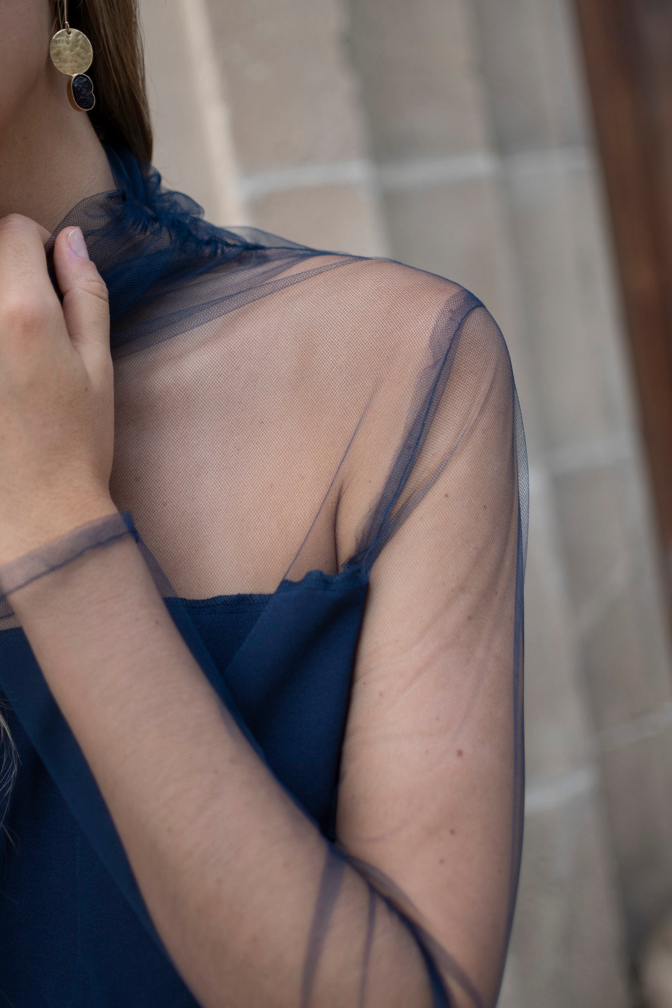 Sofisticado y atemporal, el vestido Juliette en azul noche combina elegancia y sensualidad a partes iguales. Su diseño de líneas limpias se complementa con un delicado cuello alto y mangas de tul semitransparente, que aportan un toque etéreo y femenino. El corte largo estiliza la figura, haciendo de este vestido una opción perfecta para eventos de esta temporada. Favorece especialmente por su silueta recta y el contraste entre el tejido principal y el tul.