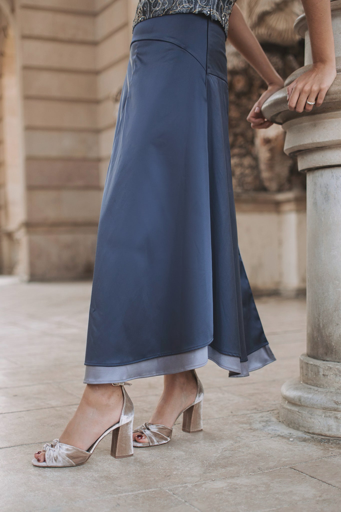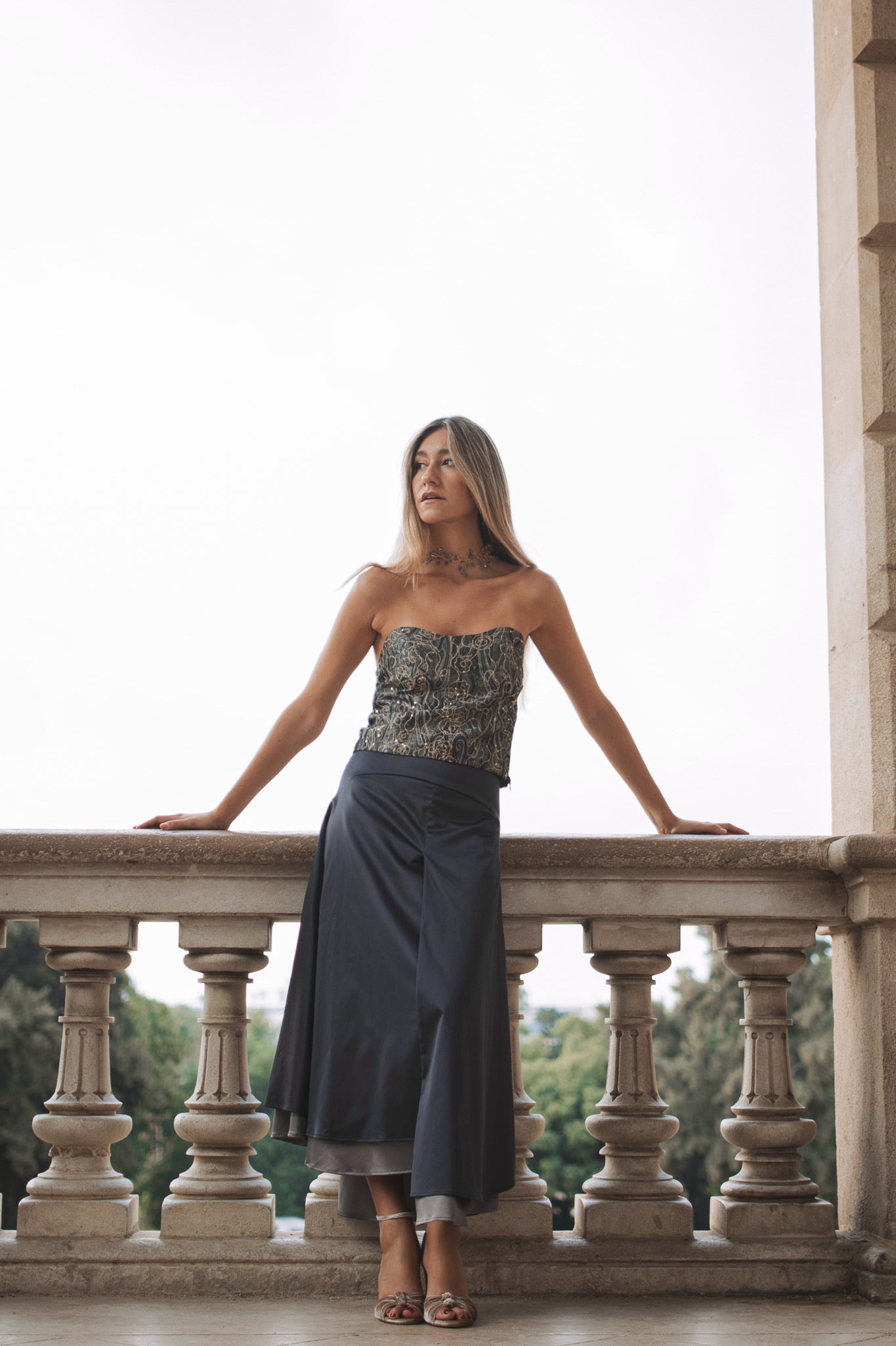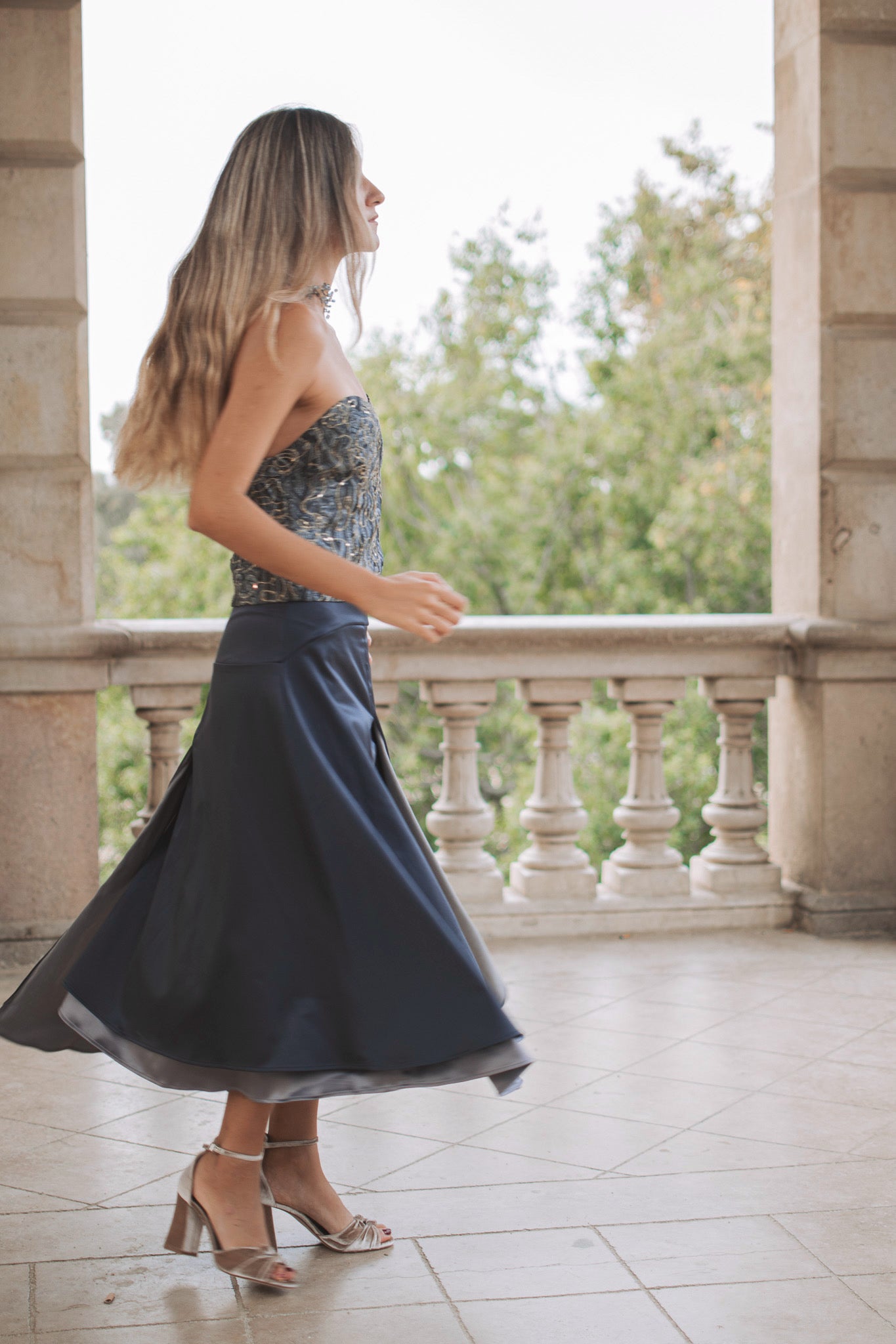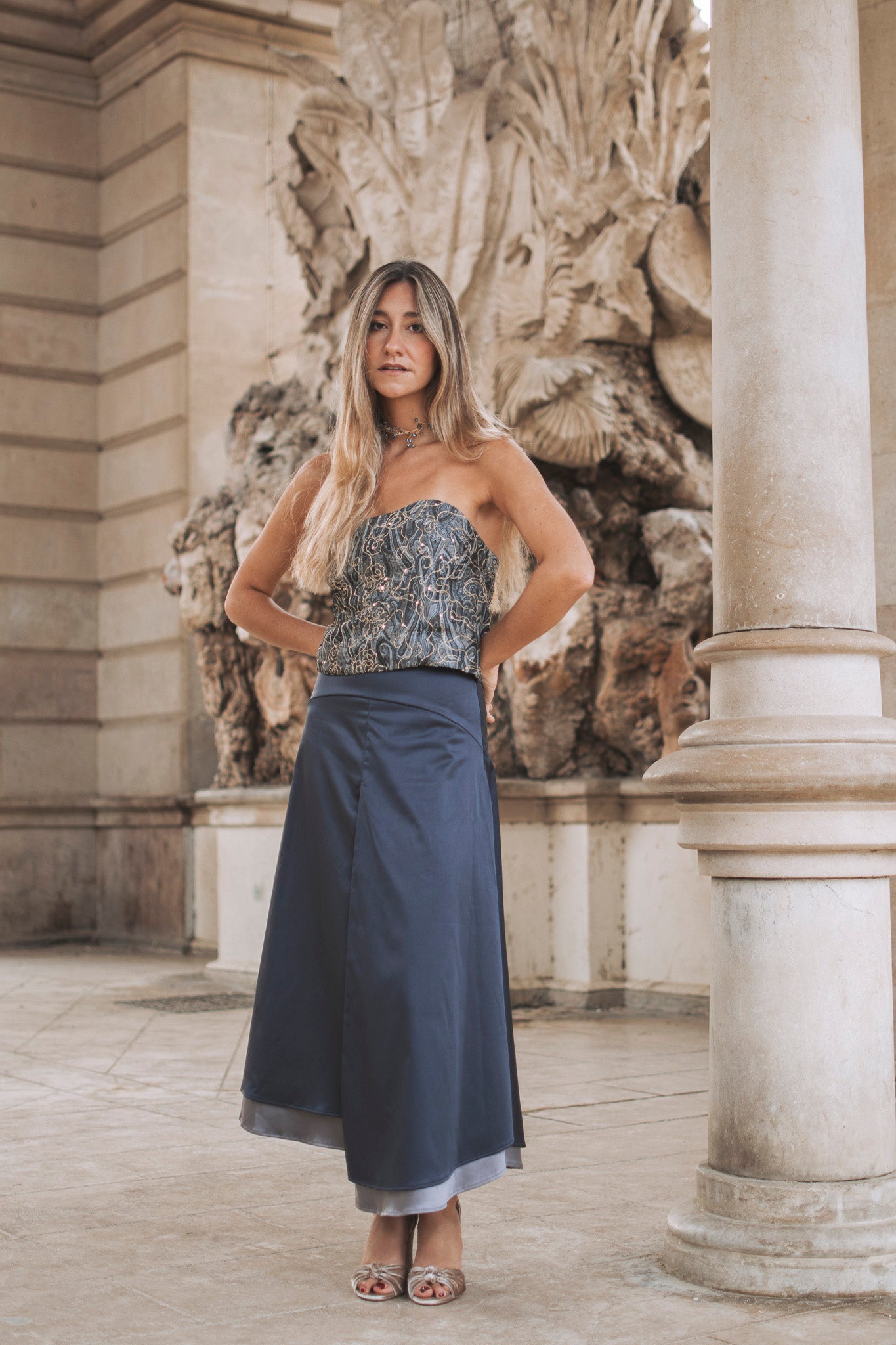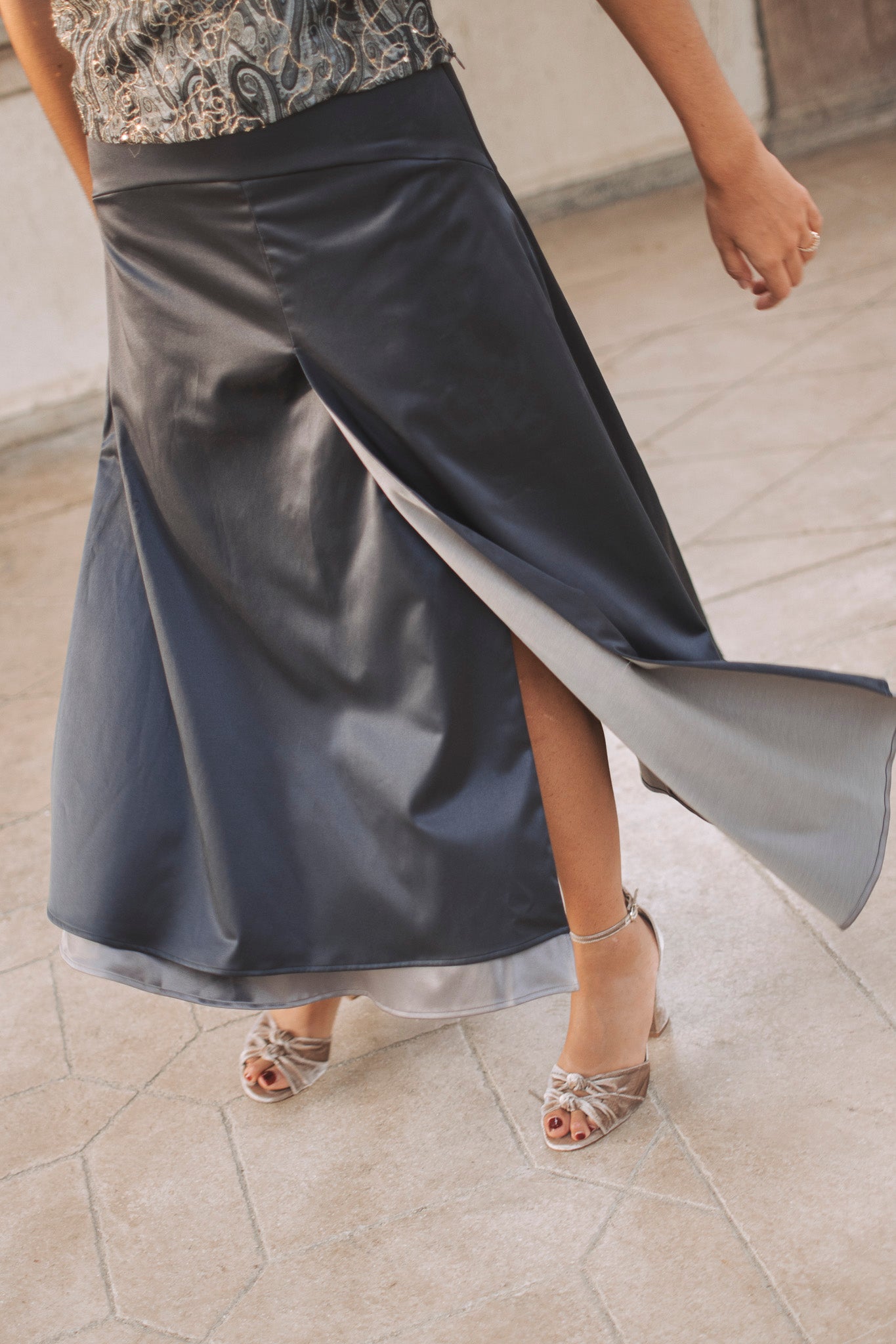 Set formado por top palabra de honor en tejido jacquard con detalles dorados y falda doble fluida a cadera en tonos grises. El top, estructurado y luminoso, destaca por su tejido con relieve y brillo sutil, perfecto para aportar sofisticación al look. La falda, con mucho vuelo y una favorecedora caída, se ajusta a la cadera y cuenta con una abertura trasera que aporta ligereza y movimiento. Una combinación muy especial, ideal para eventos donde quieras brillar con elegancia y estilo propio.